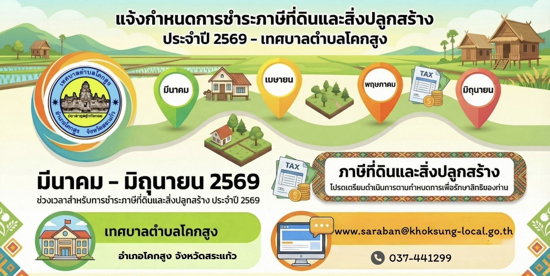 - ประชาสัมพันธ์ การชำระภาษีที่ดินและสิ่งปลูกสร้าง ประจำปี 2569 ตั้งแต่เดือน มีนาคม – มิถุนายน 2569 , 3 เมษายน 2569
