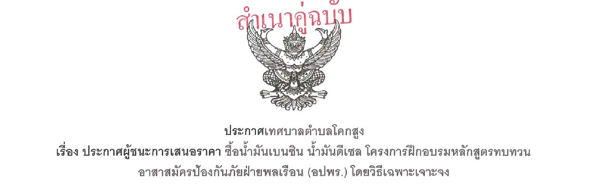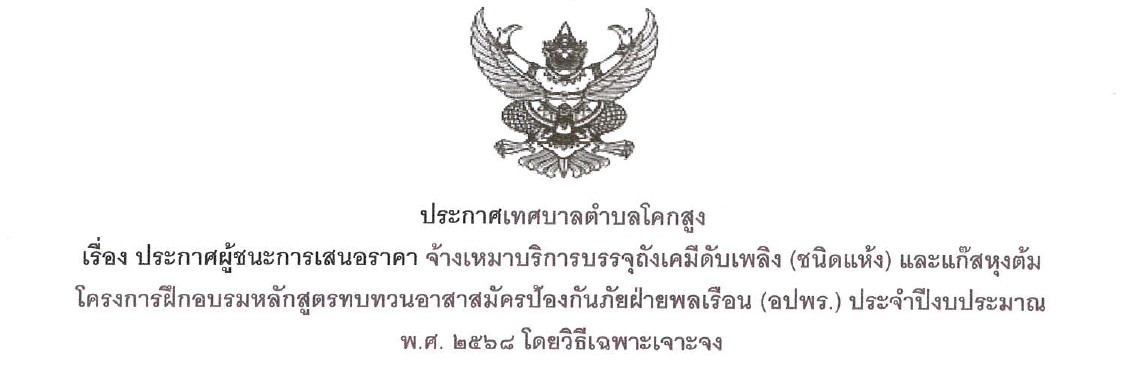 ประกาศเทศบาลตำบลโคกสูง เรื่อง ประกาศผู้ชนะการเสนอราคา จ้างเหมาบริการบรรจุถังเคมีดับเพลิง (ชนิดแห้ง) และแก๊สหุงต้ม โครงการฝึกอบรมหลักสูตรทบทวนอาสาสมัครป้องกันภัยฝ่ายพลเรือน (อปพร.) ประจำปีงบประมาณ พ.ศ. ๒๕๖๘ โดยวิธีเฉพาะเจาะจง