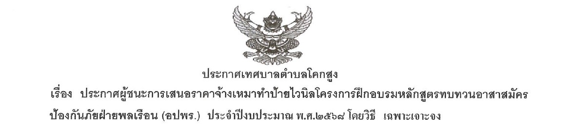 ประกาศเทศบาลตำบลโคกสูง เรื่อง ประกาศผู้ชนะการเสนอราคาจ้างเหมาทำป้ายไวนิลโครงการฝึกอบรมหลักสูตรทบทวนอาสาสมัครป้องกันภัยฝ่ายพลเรือน (อปพร.) ประจำปีงบประมาณ พ.ศ. ๒๕๖๘ โดยวิธี เฉพาะเจาะจง