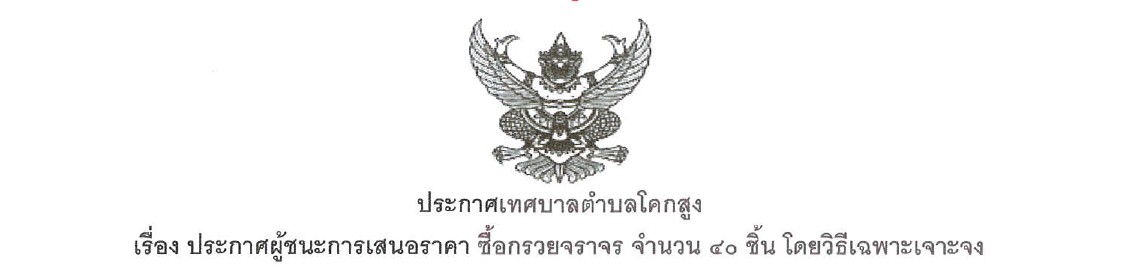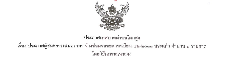 ประกาศเทศบาลตำบลโคกสูง เรื่อง ประกาศผู้ชนะการเสนอราคา จ้างซ่อมรถขยะ ทะเบียน ๘๒-๒๑๓๓ สระแก้ว จำนวน ๑ รายการ โดยวิธีเฉพาะเจาะจง