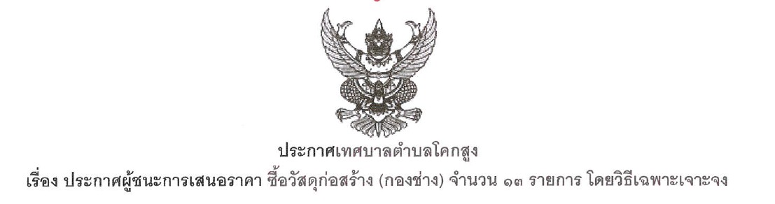 ประกาศเทศบาลตำบลโคกสูง เรื่อง ประกาศผู้ชนะการเสนอราคา ซื้อวัสดุก่อสร้าง (กองช่าง) จำนวน ๑๓ รายการ โดยวิธีเฉพาะเจาะจง