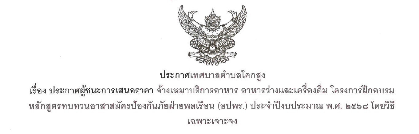ประกาศเทศบาลตำบลโคกสูง เรื่องประกาศผู้ชนะการเสนอราคา จ้างเหมาบริการอาหาร อาหารว่างและเครื่องดื่ม โครงการฝึกอบรม หลักสูตรทบทวนอาสาสมัครป้องกันภัยฝ่ายพลเรือน (อปพร.) ประจำปีงบประมาณ พ.ศ. ๒๕๖๘ โดยวิธีเฉพาะเจาะจง