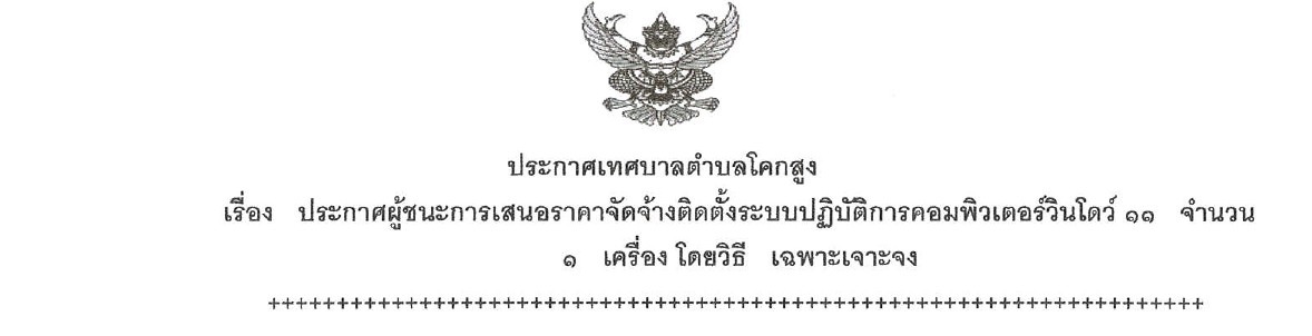 ประกาศเทศบาลตำบลโคกสูง เรื่อง ประกาศผู้ชนะการเสนอราคาจัดจ้างติดตั้งระบบปฏิบัติการคอมพิวเตอร์วินโดว์ ๑๑ จำนวน ๑ เครื่อง โดยวิธี เฉพาะเจาะจง