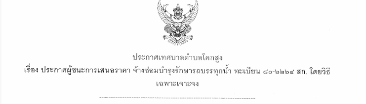 เรื่อง ประกาศผู้ชนะเสนอราคา จ้างซ่อมบำรุงรักษารถบรรทุกน้ำ ทะเบียน ๘0-๖๒๖๔