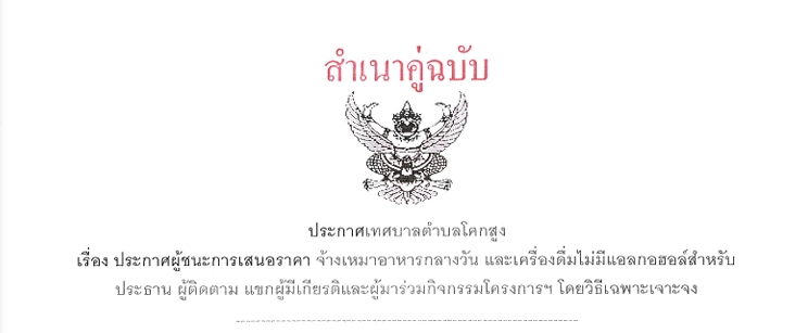 เรื่อง ประกาศผู้ชนะการเสนอราคา จ้างเหมาอาหารกลางวัน และเครื่องดื่มไม่มีแอลกอฮอล์สำหรับประธาน ผู้ติดตาม แขกผู้มีเกียรติและผู้มาร่วมกิจกรรมโครงการฯ โดยวิธีเฉพาะเจาะจง