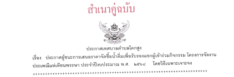 เรื่อง ประกาศผู้ชนะราคาจัดซื้อน้ำดื่มเพื่อรับรองแขกผู้เข้าร่วมกิจกรรม โครงการจัดงานประเภณีแห่เทียนเข้าพรรษา ประจำปีงบประมาณ พ.ศ. ๒๕๖๘ โดยเฉพาะเจาะจง