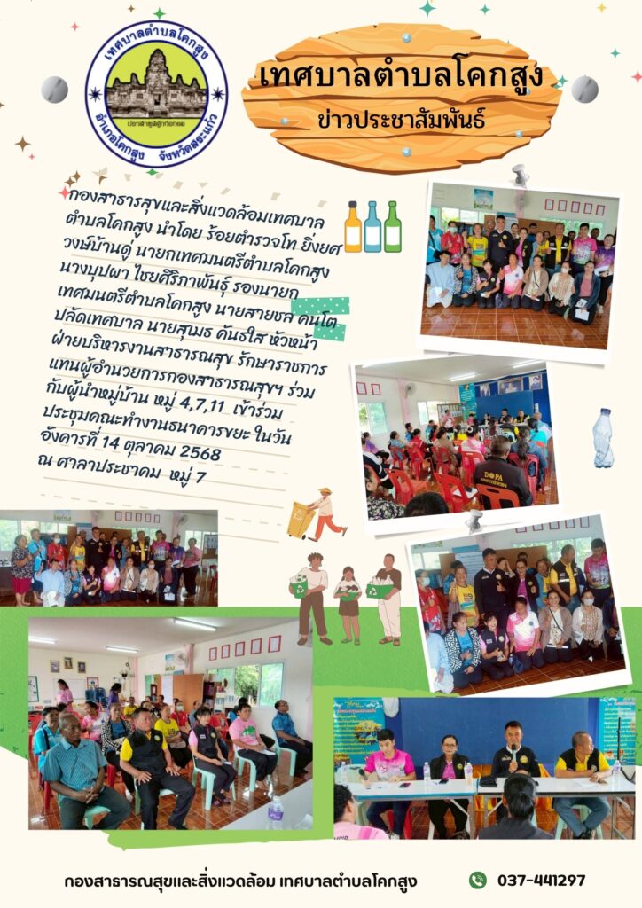 กองสาธารสุขและสิ่งแวดล้อมเทศบาลตำบลโคกสูง นำโดย ร้อยตำรวจโท ยิ่งยศ วงษ์บ้านดู่ นายกเทศมนตรีตำบลโคกสูง นางบุปผา ไชยศิริภาพันธุ์ รองนายกเทศมนตรีตำบลโคกสูง นายสายชล คนโต ปลัดเทศบาล นายสุเมธ คันธใส หัวหน้าฝ่ายบริหารงานสาธารณสุข รักษาราชการแทนผู้อำนวยการกองสาธารณสุขฯ ร่วมกับผู้นำหมู่บ้าน หมู่ 4,7,11 เข้าร่วมประชุมคณะทำงานธนาคารขยะ ในวันอังคารที่ 14 ตุลาคม 2568 ณ ศาลาประชาคม หมู่ 7