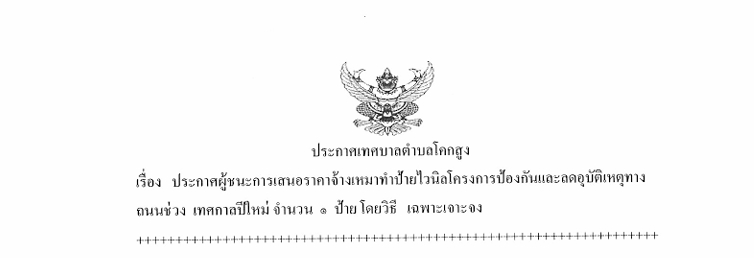 เรื่อง ประกาศผู้ชนะการเสนอราคาจ้างเหมาทำป้ายไวนิลโครงการป้องกันและลดอุบัติเหตุทางถนนช่วง เทศกาลปีใหม่ จำนวน ๑ ป้าย โดยวิธีเฉพาะเจาะจง