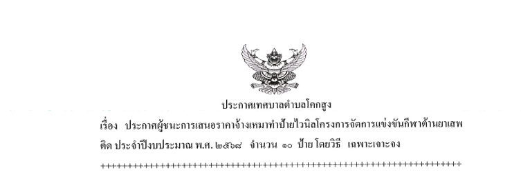 เรื่อง ประกาศผู้ชนะการเสนอราคาจ้างเหมทำป้ายไวนิลโครงการแข่งขันกีฬาต้านยาเสพติด ประจำปีงบประมาณ พ.ศ. ๒๕๖๘ จำนวน ๑๐ ป้าย โดยวิธีเฉพาะเจาะจง