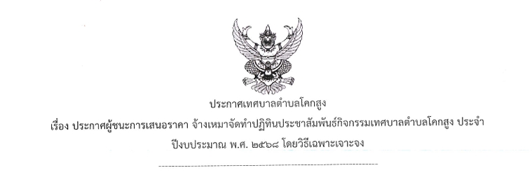 เรื่อง ประกาศผู้ชนะการเสนอราคา จ้างเหมาจัดทำปฏิทินประชาสัมพันธ์กิจกรรมเทศบาลตำบลโคกสูง ประจำปีงบประมาณ พ.ศ. ๒๕๖๘