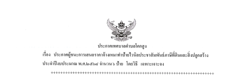 เรื่อง ประกาศผู้ชนะการเสนอราคาจ้างเหมาทำป้ายไวนิลประชาสัมพันธ์ภาษีที่ดินและสื่งปลูกสร้างประจำปีงบประมาณ พ.ศ. ๒๕๖๘ จำนวน ๖ป้าย โดยเฉพาธเจาะจง